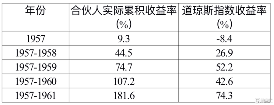 说完了这些,大家应该知道了,1960年是我们战胜指数的一年。去年,道指整体亏损6.3%,我管理的七个合伙人账户取得了22.8%的收益。在扣除经营费用之后,不算支付给有限合伙人的利息和普通合伙人的分成,在过去四年中,合伙公司的业绩如下: