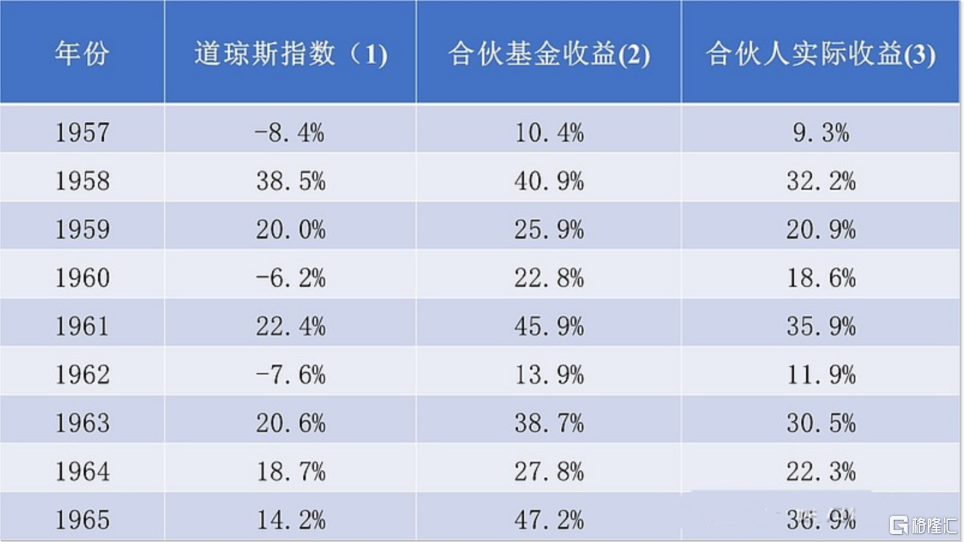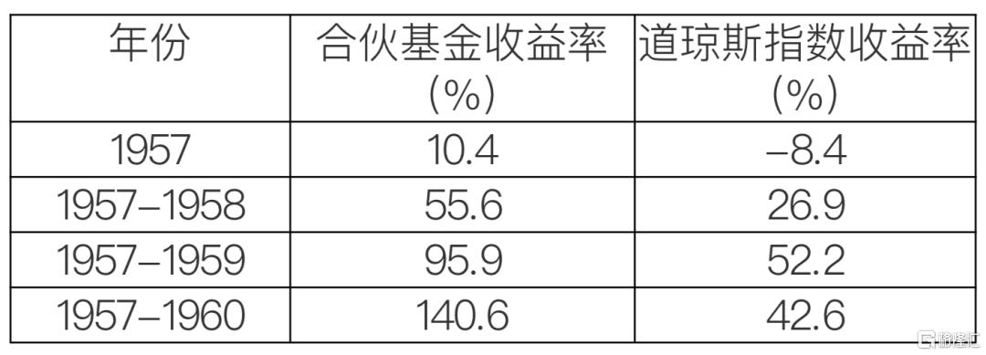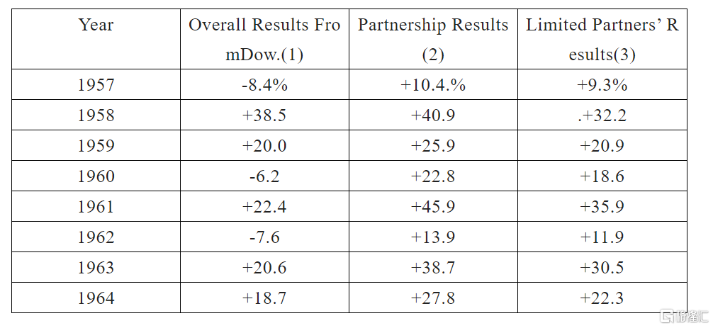 说完了这些,大家应该知道了,1960年是我们战胜指数的一年。去年,道指整体亏损6.3%,我管理的七个合伙人账户取得了22.8%的收益。在扣除经营费用之后,不算支付给有限合伙人的利息和普通合伙人的分成,在过去四年中,合伙公司的业绩如下:
