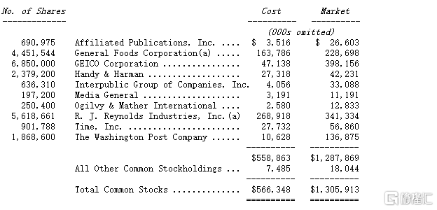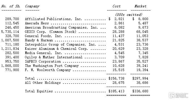 表上的投资组合与去年几乎相同,只有一项投资的持股有变动,我们将可口可乐的持股数由去年的1,417万股提高到今年的2,335万股。