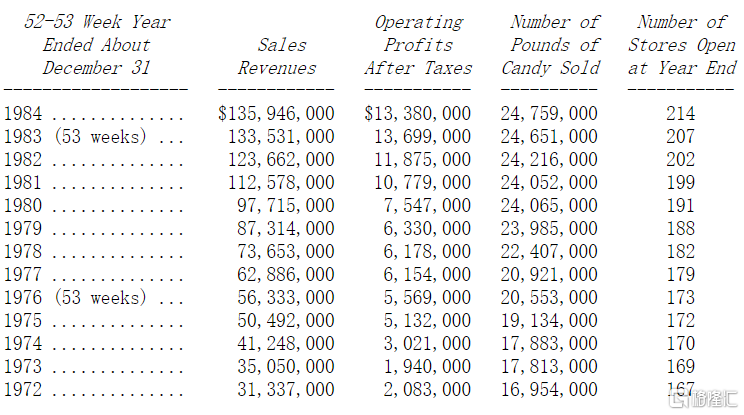 自现有经营阶层接掌伯克希尔(1964-1979)的十五年来,公司每股净值由19.46美元成长至335.85美元(持有股票投资以市价计),年复合成长率达20.5%。这个比率远高于每年营业利益率的平均数,突显保险子公司股票增值利益对于股东权益的重要性,而且1964年的帐面价值实际上超过其实质价值,因为当时帐列的资产不论是以继续经营或清算的基础来看,其价值都远低于帐面净值,(至于负债则一毛也少不了)。