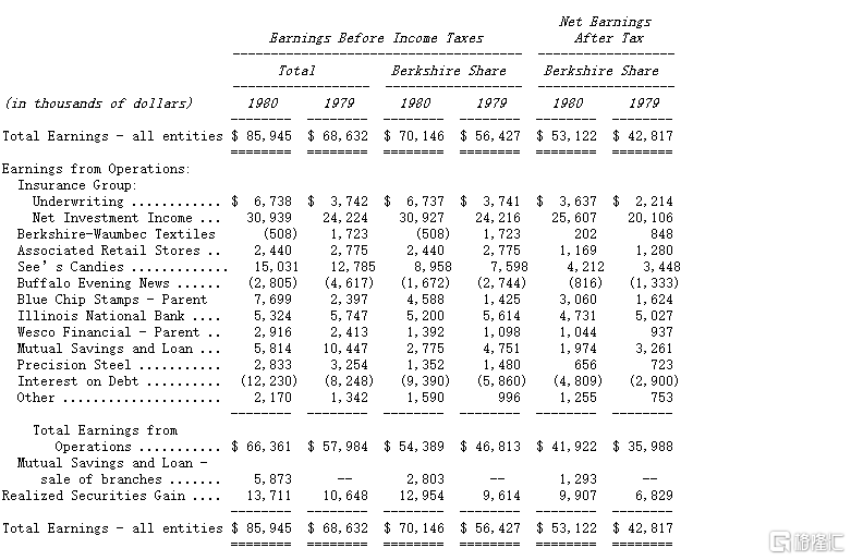 下表系伯克希尔盈余的报告,去年我们曾向各位说明过,伯克希尔持有蓝筹邮票60%的股权,后者又持有80%的Wesco金融公司,表中显示各个事业体的盈余合计数,以及伯克希尔依持股比例可分得的部份,各事业体的资本利得或损失则不包含在营业利益项下,而是加总列在已实现资本利得项下。