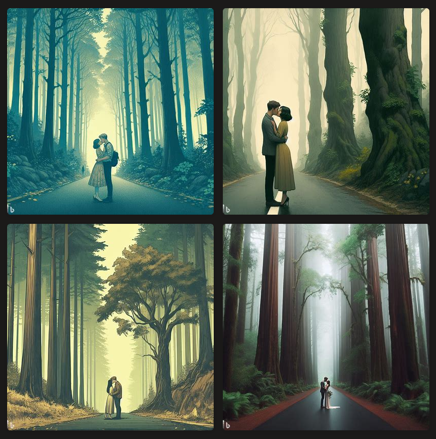 在这里是可以直接进行绘画的,直接要这里告诉助手你要画的是什么就可以,比如,我告诉AI:帮我画一幅画:参天的大数,干净幽远的道路,微微有雾,一对帅气的恋人正在大树下拥吻,整个意境传达出安静、浪漫、唯美的感觉。