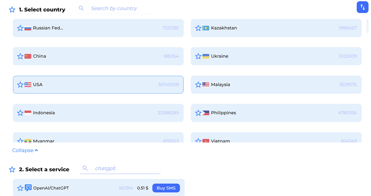 有了余额之后,你只需要选择国家,选择你要使用的服务(Chgpt),如下图,接收一条短信是0.51美元。