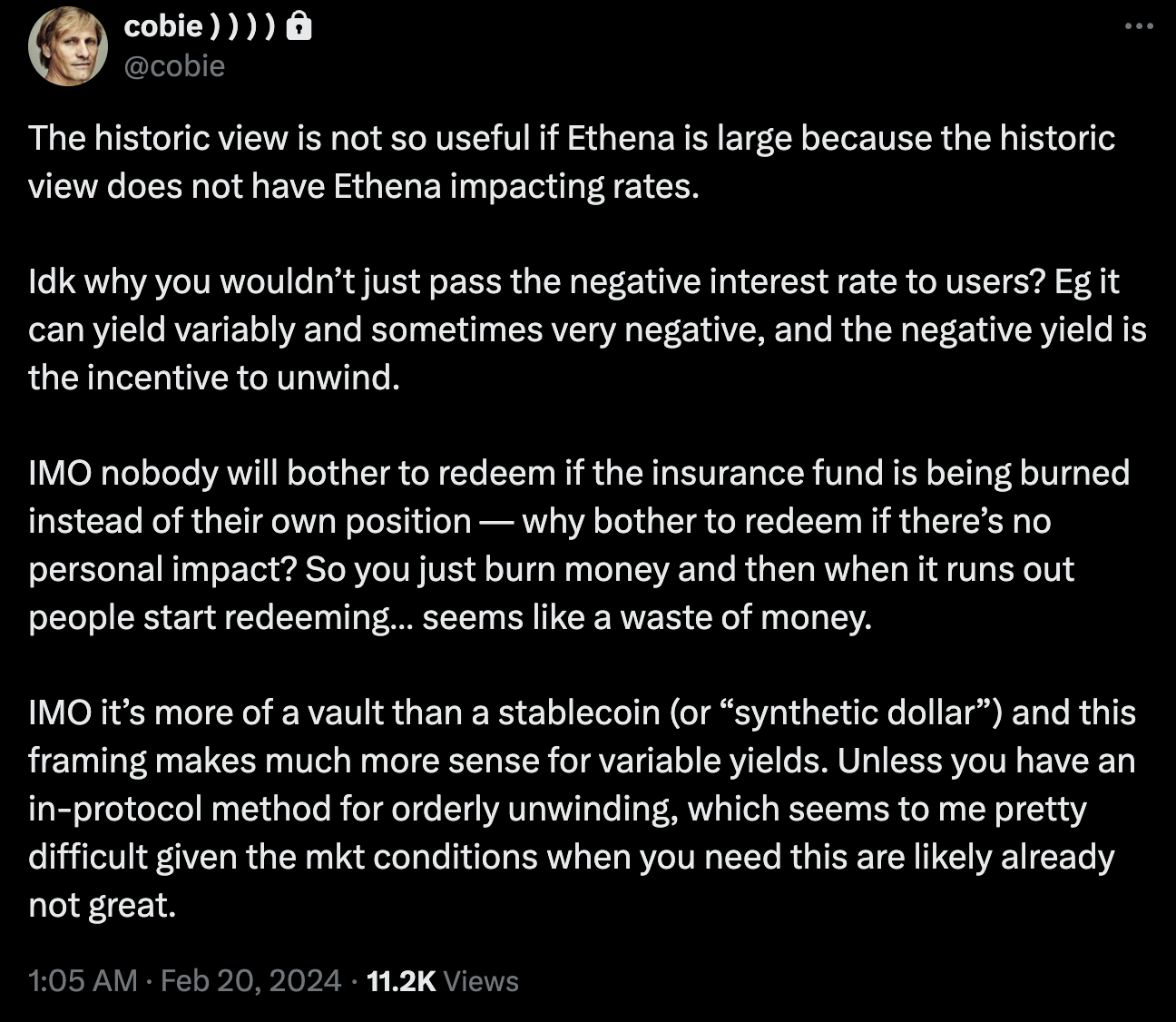 Ethena 可以像 Cobie 在下文中建议的那样,选择将负收益率转嫁给持有人,这将鼓励人们更快地赎回,以应对资金的变化,从而使负反馈循环更加强大。